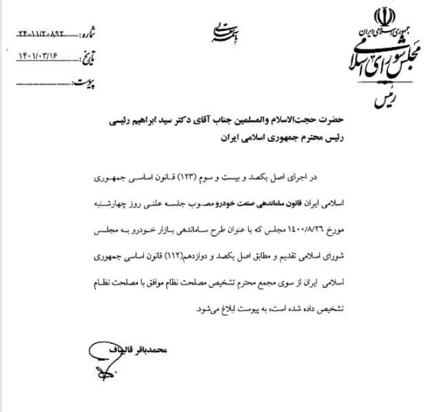 براساس ماده 4 قانون ساماندهی صنعت خودرو که توسط محمد باقر قالیباف ابلاغ شد وزارت صمت باید آیین نامه واردات خودرو را تنظیم و تصویب کند.