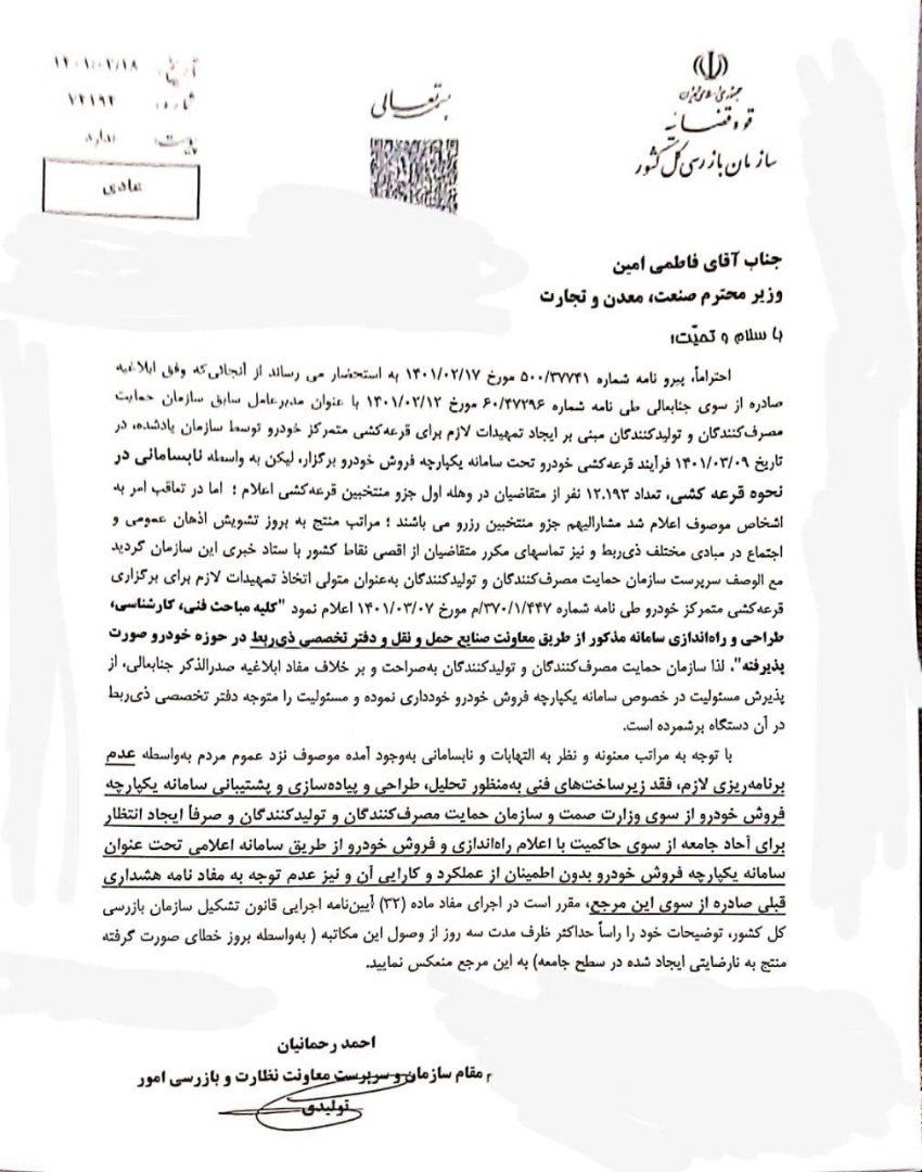 سازمان بازرسی کل کشور به وزیر صمت، برای نابسامانی در سامانه یکپارچه فروش خودرو و نحوه قرعهکشی تذکر داد.