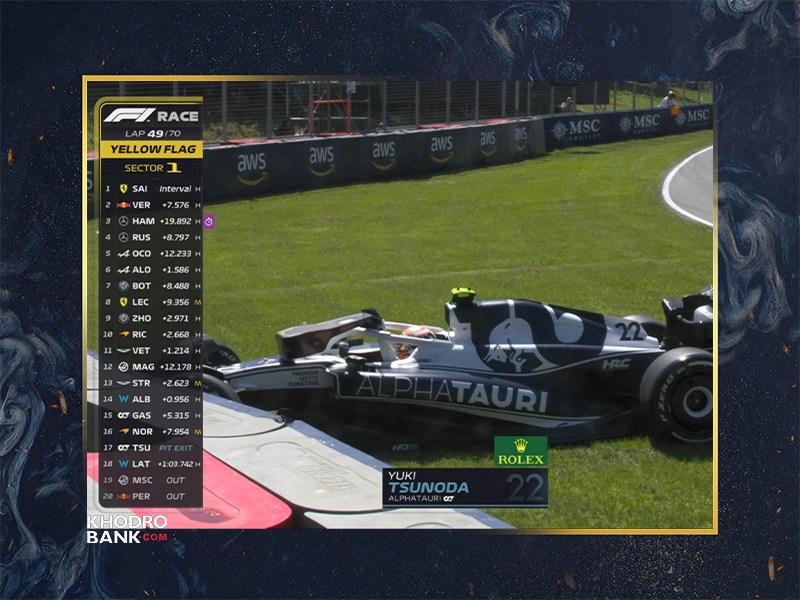 خروج سونودااز پیست و برخورد با دیواره - فرمول یک کانادا2022خودروی ایمنی مجازی به لطف سونودافعال شد و خودروی ایمنی وارد پیست شد ولی کمی دیر بود و ساینز تنها تواست رده دوم را در اختیار بگیرد و از خطر تهدید رده توسط همیلتون گریخت. با این شرایط وضعیت لکلرک برای رسیدن به ردههای بالا سختتر شد. بخصوص اینکه آلونسو و اوکون هر دو لاستیک مدیوم را انتخاب کردند.