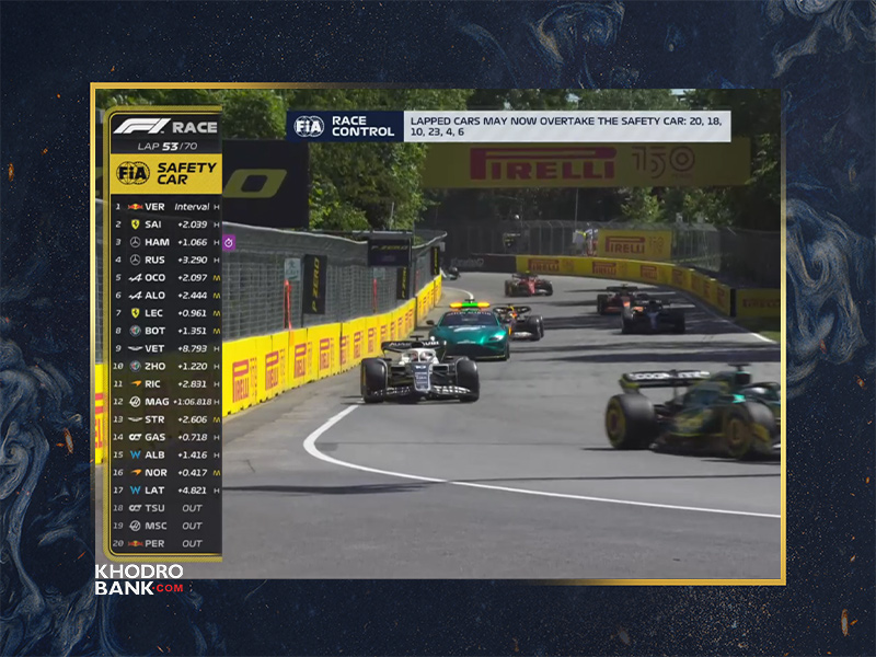 عبور خودروهای لپی در زمان خودروی ایمنی - فرمول یک کانادا 2022دور 53 همچنان خودروی آستون مارتین ایمنی در پیست حاضر بود و ماشینهای لپی اجازه پیدا کردند تا از خودروهای پیشتاز عبور نمایند و به جای خود برگردند. دور 54 هم با خودروی ایمنی ادامه پیدا کرد و اعلام شد که در انتهای این دور مسابقه مجدد آغاز خواهد شد و خودروی ایمنی خارج میشود.