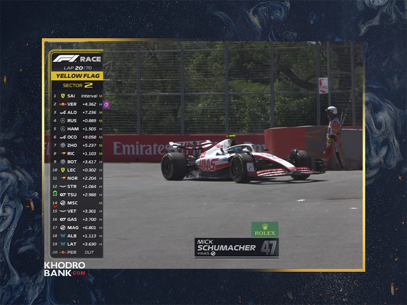 خروج پرز از مسابقه - فرمول یک کانادا 2022 ساینز زمان را به 1:17 کاهش داد و خروج پرز خودروی ایمنی مجازی را تا خروج کامل ماشین از پیست فعال کرد.