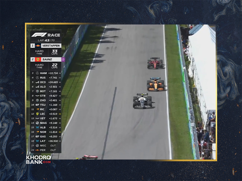 ساینز هم در دور 40 به مکس نزدیک میشد و فاصله را به حدود 6 ثانیه رساند. مکس 30 دور با لاستیک هارد زده بود مثل همیلتون و ساینز و راسل 20 دور زده بودند.
