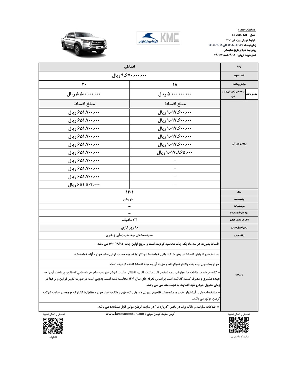 شرایط فروش تیرماه 1401 خودرو پیکاپ KMC T8 کرمان موتور بهصورت اقساطی بوده با قیمت مصوب و قطعی 9,670,000,000 ارائه میشود. شرایط فروش این خودرو در دو مدل 18 و 30 ماهه انجام میشود.