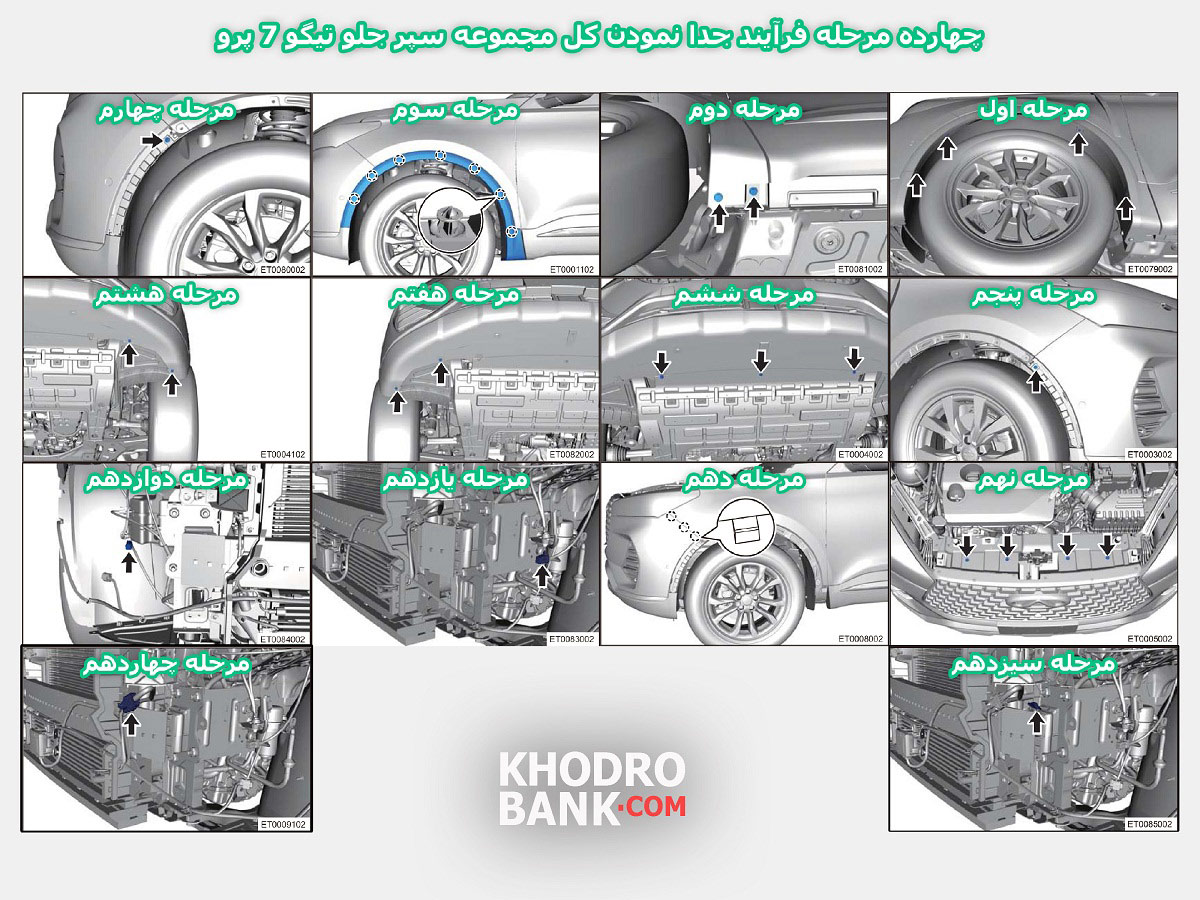 سپر جلو به همراه متعلقاتشفرایند جدا نمودن کل مجموعه سپر جلو به همراه متعلقاتش از بدنه خودرو مراحل مختلف و متعددی دارد و باید تعداد زیادی پیچ و خار و پین را بازنمود و سوکتهای برقی مختلف مربوط به چراغ مهشکن، چراغ روشنایی در روز، آنتن سامانه رادار، حسگرهای فراصوتی سامانه هشدار برخورد با موانع جلویی و درنهایت دوربین جلو را جدا نمود. برای نمونه فرایند جدا نمودن کل مجموعه سپر جلو خودرو تیگو 7 پرو شامل 14 مرحله است که در تصویر زیر این 14 مرحله به ترتیب نشان شده است.