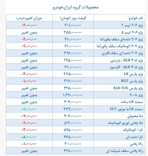 پژو ۲۰۰۸ بدون تغییر ۱ میلیارد و ۳۸۰ میلیون تومان معامله می شود.سمند LX در مدل ۱۴۰۱ بدون تغییر ۳۰۴ میلیون تومان قیمت خورد.