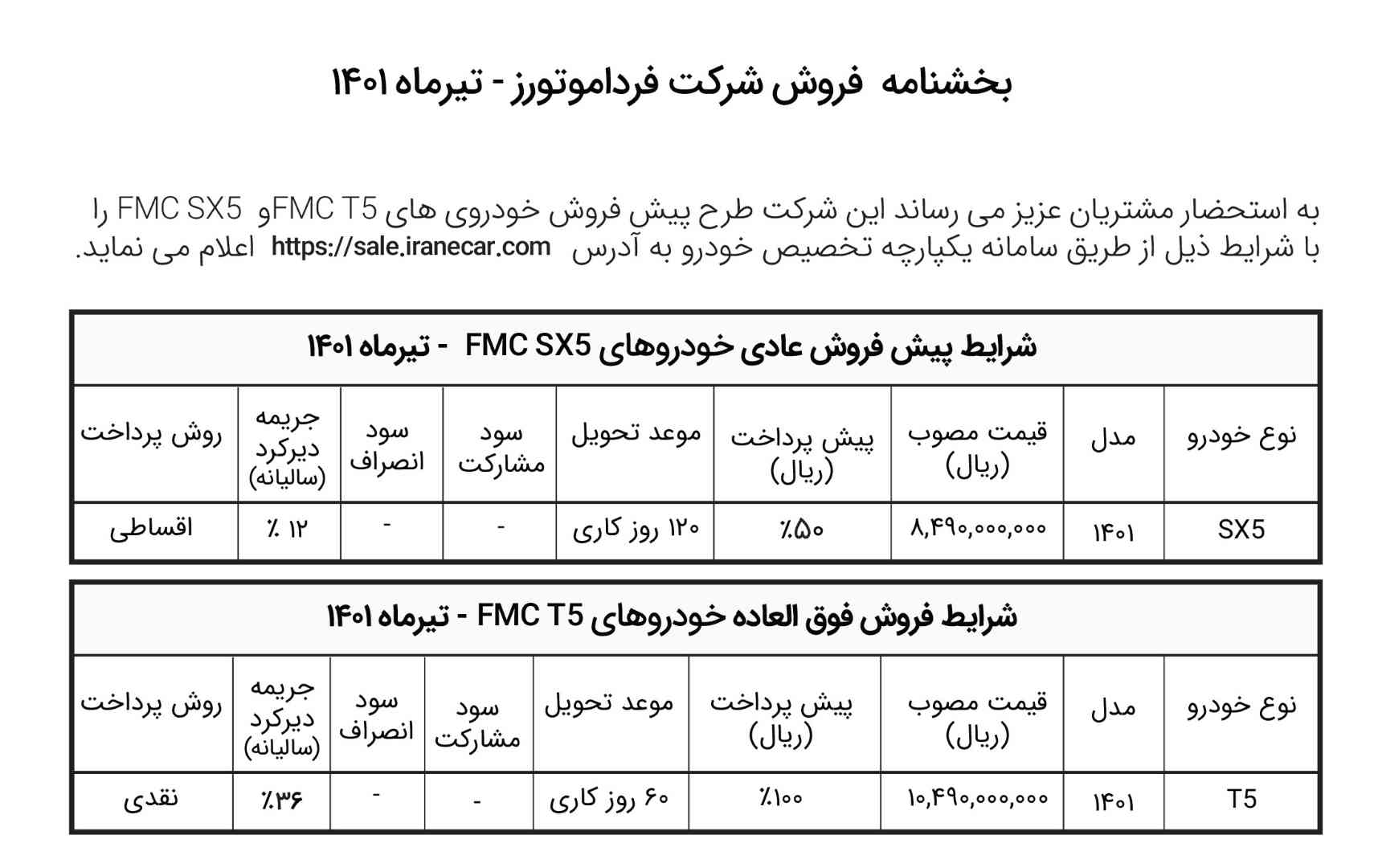 فردا موتورز، پس از پشت سر گذاشتن چالش هاي سامانه يكپارچه تخصيص خودرو، بالاخره شرايط فروش FMC T5 و FMC SX5 را اعلام كرد.