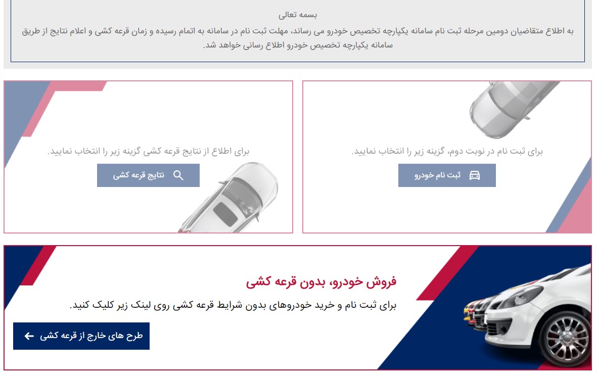 مرحله دوم فروش خودرو از طریق سامانه یکپارچه تخصیص خودرو به مناسبت عید غدیر خم به مدت سه روز از 25 تیرماه تا سهشنبه 28 تیرماه انجام شد.
