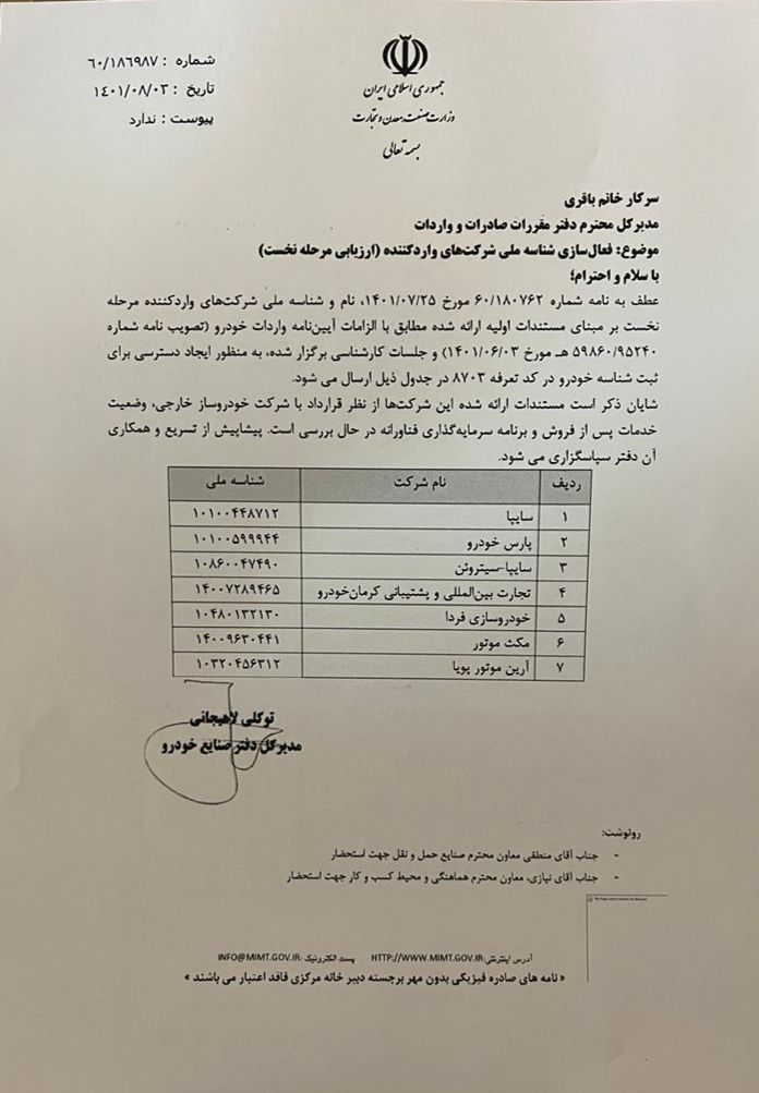 در این نامه اعلام شده است که شرکتها مستندات خود را در خصوص قرارداد با شرکت خودروساز خارجی، وضعیت خدمات پس از فروش و مبحث انتقال فناوری ارائه کردهاند و درحال بررسی است.