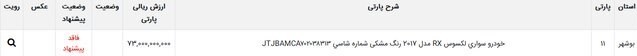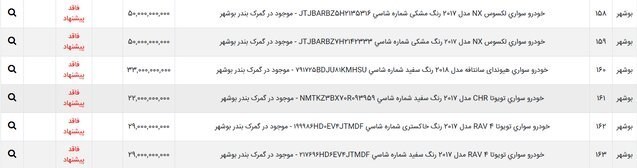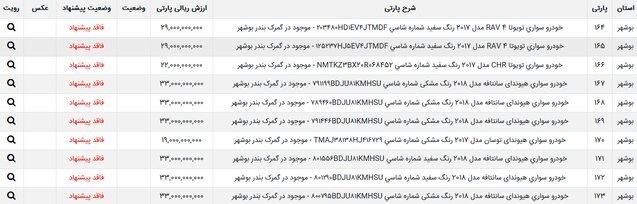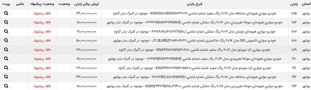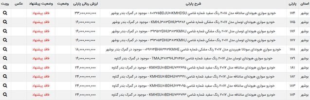 بر این اساس، خودرو سواری BMW 730LI مدل 2017 رنگ مشکی، خودرو سواری هیوندای سانتافه مدل 2017 رنگ سفید، لکسوس NX مدل 2017، تویوتا CHR مدل 2017، تویوتا RAV4 مدل 2017، کیا سورنتو مدل 2017، هیوندای سوناتا هیبریدی مدل 2017، هیوندای توسان مدل 2017، خودرو سواری سراتو YD مدل 2017 رنگ مشکی در بندر بوشهر و گناوه و گمرک استان خوزستان در این مزایده عرضه خواهند شد.