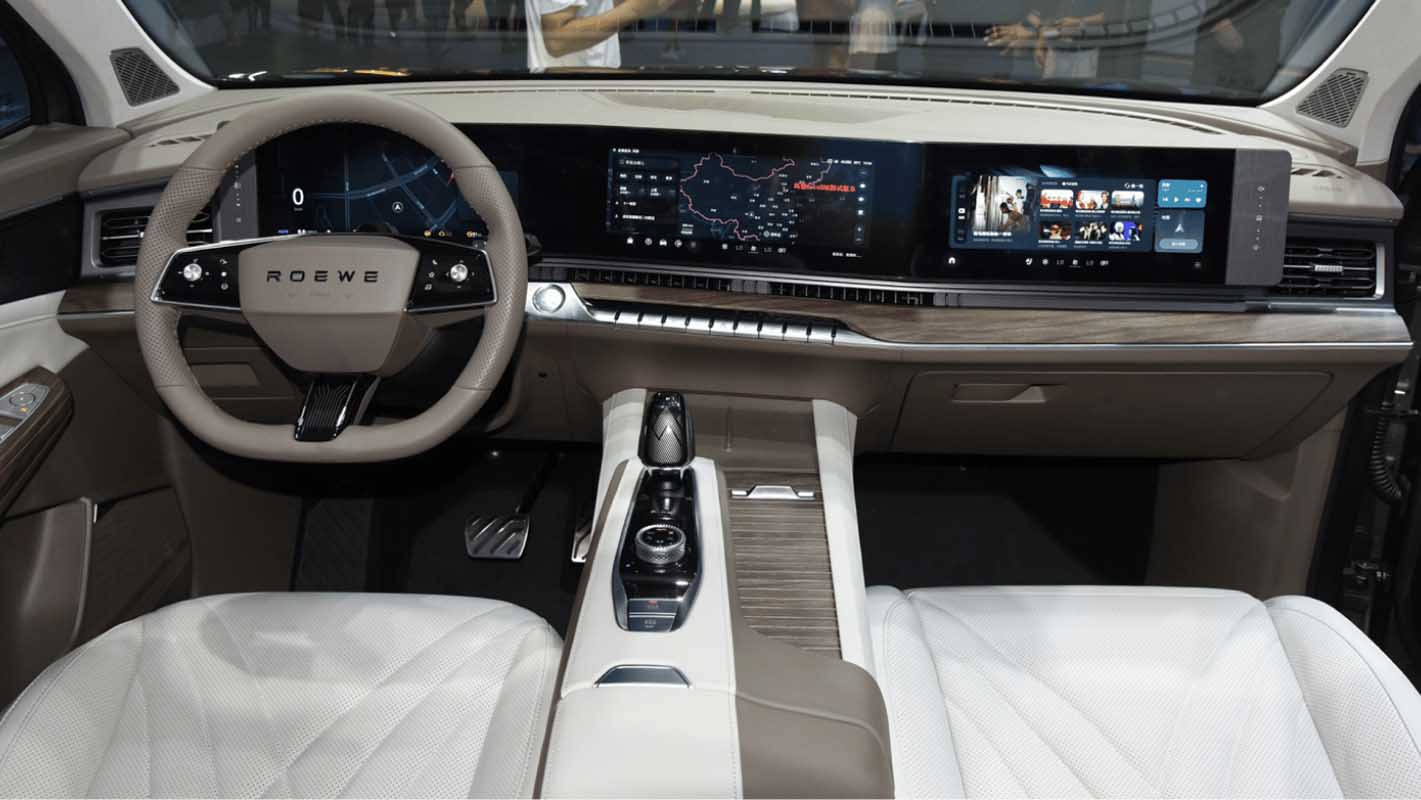 فضای داخلی Roewe RX9 علمی تخیلی به نظر میرسد، عمدتاً به دلیل وجود یک صفحه نمایش بسیار بزرگ در کنسول مرکزی است که شامل یک صفحه ابزار، یک صفحه نمایش مرکزی برای راننده و یک صفحه برای سرنشین میشود. قطر دقیق هر صفحه نمایش مشخص نیست. اما Roewe اشاره کرده که قطر این صفحه نمایش سه گانه به 47 اینچ میرسد. به غیر از صفحه نمایش، میتوانیم فرمان سه پره D کات، مجموعهای از دکمههای کوچک روی کنسول مرکزی و انتخابگر دنده با ظاهری عجیب را مشاهده کنیم. در مجموع، فضای داخلی Roewe RX9 مکان خوبی برای حضور به نظر میرسد.
