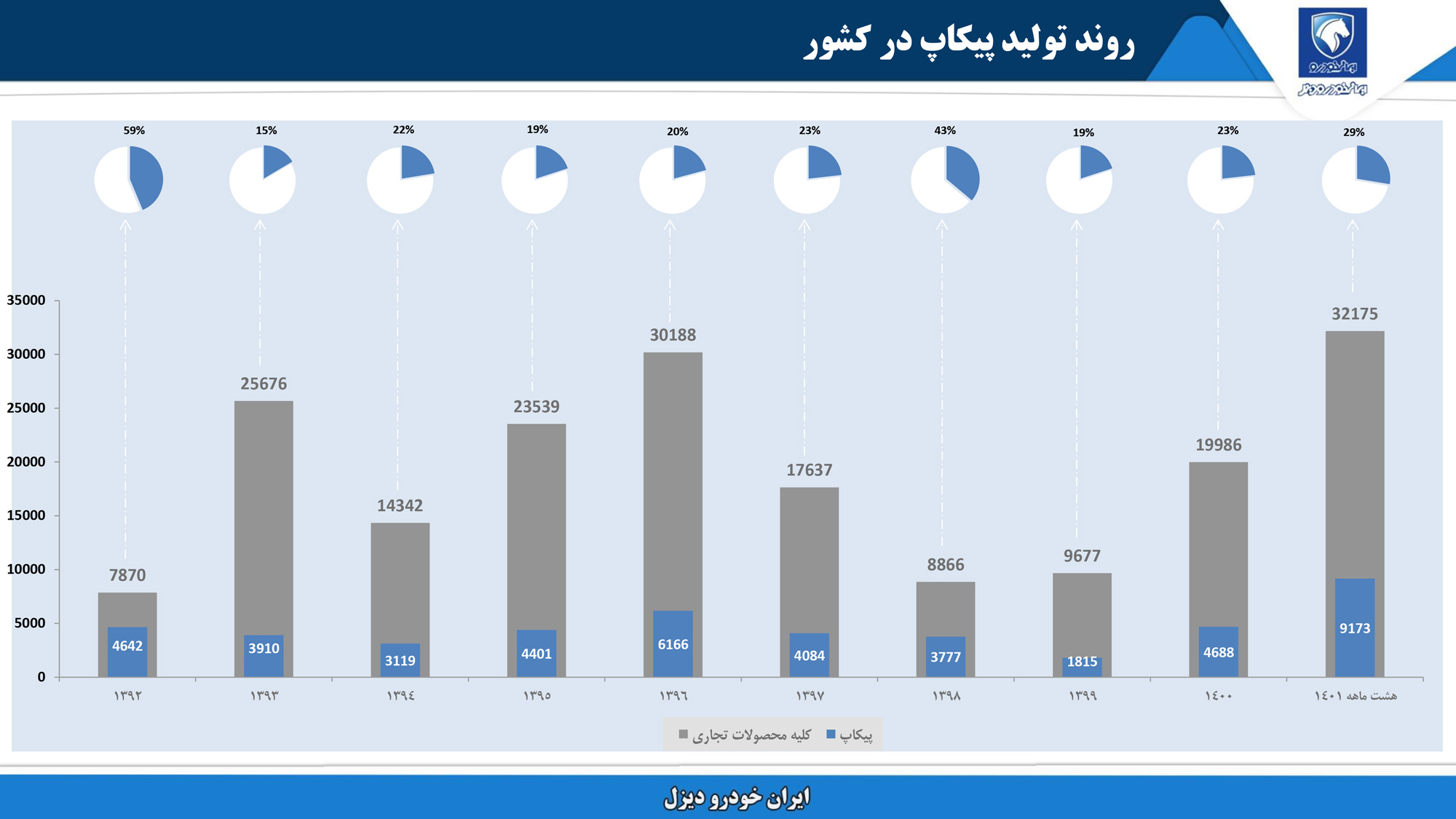 در نموداری از میزان مونتاژ و تولید محصولات پیکاپ در یک دهه گذشته کشور که توسط گروه صنعتی ایران خودرو منتشر شده است، شاهد هستیم که در سال 1392 میزان تولید خودروهای پیکاپ 7870 ثبت شده است و از این میزان 4642 دستگاه (59 درصد) مربوط به شرکت ایران خودرو بوده است. در ادامه سال 1393 با یک جهش رشد در تولید پیکاپها مواجه هستیم که یکی از دلایل اصلی آن را میتوان شروع تولید وانت پراید در تیراژ بالا دانست. در این سال مجموعا 25676 دستگاه پیکاپ در کشور تولید شد که سهم ایران خودرو با 3910 دستگاه (15درصد) بوده است. در سال 1394 از مجموع 14342 دستگاه پیکاپ تولید سهم ایران خودرو 3119 دستگاه (22 درصد) بود. به گفته کارشناسان سال 1395 و 1396 را میتوان سالهای طلایی خودرو دانست، سالهایی که با اجرایی شدن برجام و با حضور خودروسازان خارجی در کشور همراه بود و بازار پیکاپها نیز از این تغییر بزرگ بینصیب نبود. سال 1395 با 23539 دستگاه تولید پیکاپ (سهم ایران خودرو 4401 دستگاه با 19 درصد کل) و سال 1396 با 30188 دستگاه (سهم ایران خودرو 6166 دستگاه یا 20 درصد) به عنوان دوسال پربازده برای صنعت محصولات تجاری سبک و پیکاپها بودند. اما این مسیر صعودی از همان ابتدای سال 97 متوقف شد و رو به مسیر نزولی تغییر مسیر داد. در سال 1397 تولید پیکاپها با کاهش حدود 5 درصدی به عدد 17637 رسید که سهم ایران خودرو از این تولید 4084 دستگاه (20 درصد کل) بود. در سال 1398 وضعیت بدتر شده و تولید با کاهش حدود 60 درصدی به نزدیکی آمار سال 1392 رسید. در این سال با تولید 8866 دستگاه پیکاپ در مجموع (سهم ایران خودرو 3777 دستگاه یا 43 درصد) دومین سال ضعیف از نظر تولید پیکاپها بود.