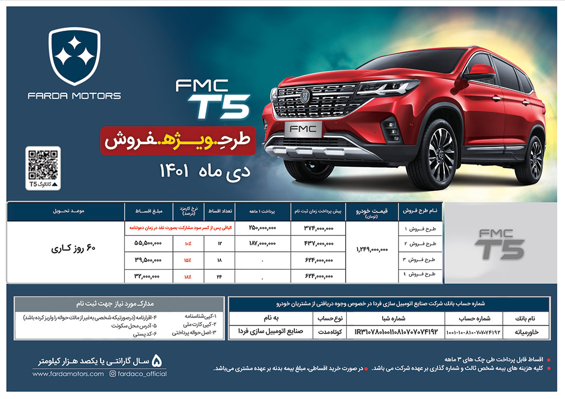 شرکت فردا موتورز شرایط فروش ویژه محصولات سواری خود را با قیمت جدید برای دی ماه ۱۴۰۱ اعلام کرد. در این طرح فروش مشتریان می توانند کراساوور FMC T5 را به صورت نقدی و اقساطی خریداری کنند.