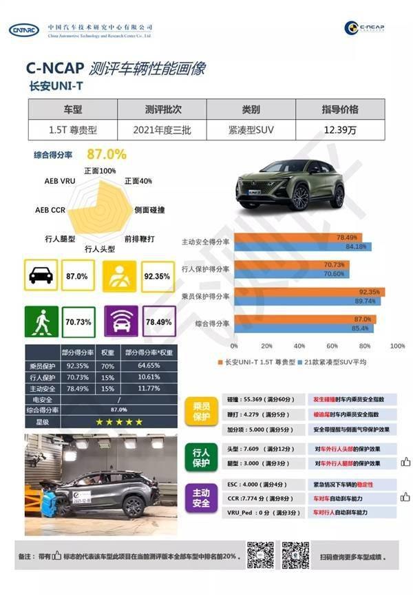 کسب 5 ستاره ایمنی توسط چانگان UNI-T در تست C-NCAPآزمونهای ایمنی و تست تصادف در مجموعه C-NCAP به سه بخش و با اهداف مختلف تقسیم میشود. نکته اول و مهم در این تستها تصادف موضوع حفاظت از سرنشینان خودرو است که در تستهای برخورد از جلو به 2 مدل با شدت 100 درصد و 40 درصد و همچنین تست برخورد جانبی با موانع تغییر شکلدهنده و تست محافظت از گردن سرنشین در تصادفات با سرعت پایین انجام میشود و کراس اوور چانگان یونی تی با امتیاز عالی 92.3 درصد حفاطت از این آزمایش سربلند بیرون آمده است.