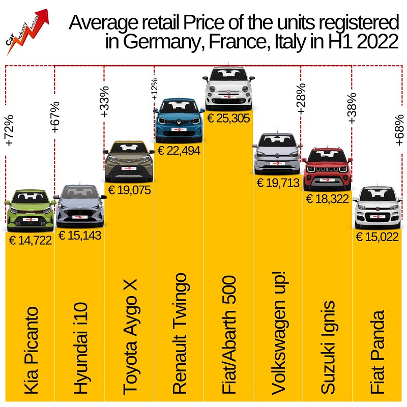 با بررسی آمارهای خرده فروشی فیات 500 و نسخههای مختلف آن همچون آبارث 500، متوجه خواهید شد که این خودرو نسبت به رقبای اصلی خود گرانتر است. برای مثال متوسط قیمت فیات 500 حدود 28 درصد گرانتر از فولکس واگن آپ، 33 درصد بیشتر از تویوتا آیگو X و 72 درصد گرانتر از کیا پیکانتو است. حتی در خانواده محصولات فیات نیز قیمت مدل 500 گرانتر از سایر نسخهها است. برای مثال خرید فیات 500 نیاز به صرف 68 درصد بودجه بیشتری نسبت به خرید فیات پاندا خواهد داشت. با این حال این فیات 500 است که لقب پرفروشترین خودرو برند ایتالیایی را در اختیار دارد.