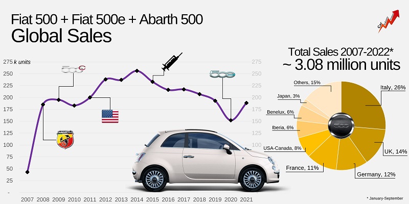 آمار فروش فیات 500فیات تصمیم ندارد تا برند 500 را کنار بگذارد. این شرکت در سال 2020 نسخه برقی فیات 500 را نیز روانه بازار کرد. همزمان با افزایش فروش این مدل در اروپا، سایر بازارها همچون کشورهای در حال توسعه با محصولات جایگزین مدل 500 پر شدند. بنابراین میتوان گفت که مدل 500 امروزه یک محصول کاملا اروپایی است.