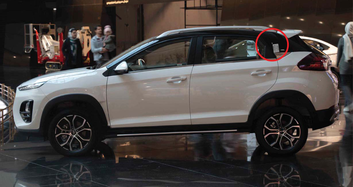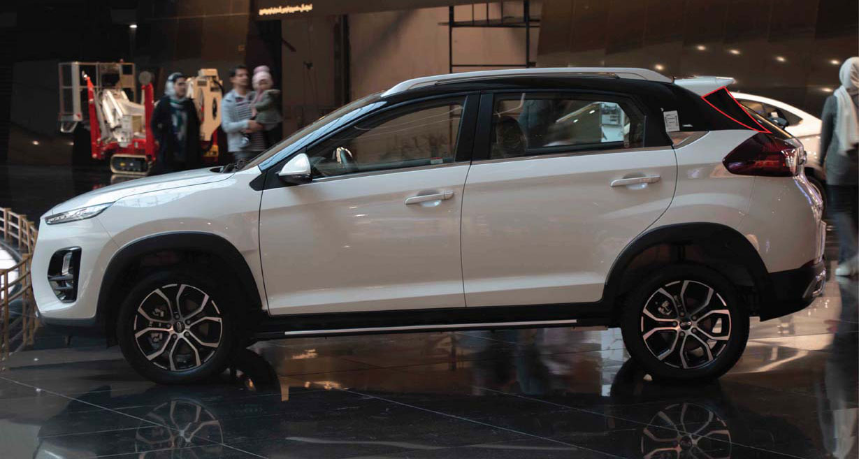 لچکی شیشهی عقب مشکیتا حس کوتاه بودن گرینهاوس (Green House) در مخاطب، به عنوان یکی از المان های جذابیت و فشن دیزان بودن تداعی شود. در اینجا به طراحی جزئیات این خودرو اشاره باید کرد، که به انتقال فرم درست سقف شناور کمک میکند. اول اینکه در امتداد ستون C این خودرو لچکی شیشهی عقب مشکی شده است، که ستون C از نظر بصری بسیار پهنتر به نظر میرسد.