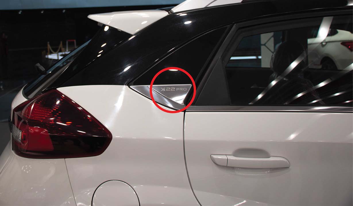 حک عبارت ایکس 22 پرو بر روی نوار کرومیدر ادامه کمی بالاتر را تماشا کنید، شاهد یک باربند تزئینی هستیم که به رنگ نقرهای در آمده است. این قطعه که رنگی متضاد با سقف شناور خودرو دارد، بهتر بود که با رنگ سقف خودرو هماهنگ شود، تا به کمک مفهوم سقف شناور بیاید، درست همانند اتفاقی که در هیوندای کونا و سایر کراساوورهای دارای سقف شناور شاهد هستیم، که از نظر بصری برای پذیرش راحتتر این مفهوم به چشمان ما کمک میکند. اما جدا بودن رنگ این باربند با سقف به سرعت میتواند خودنمایی کند.