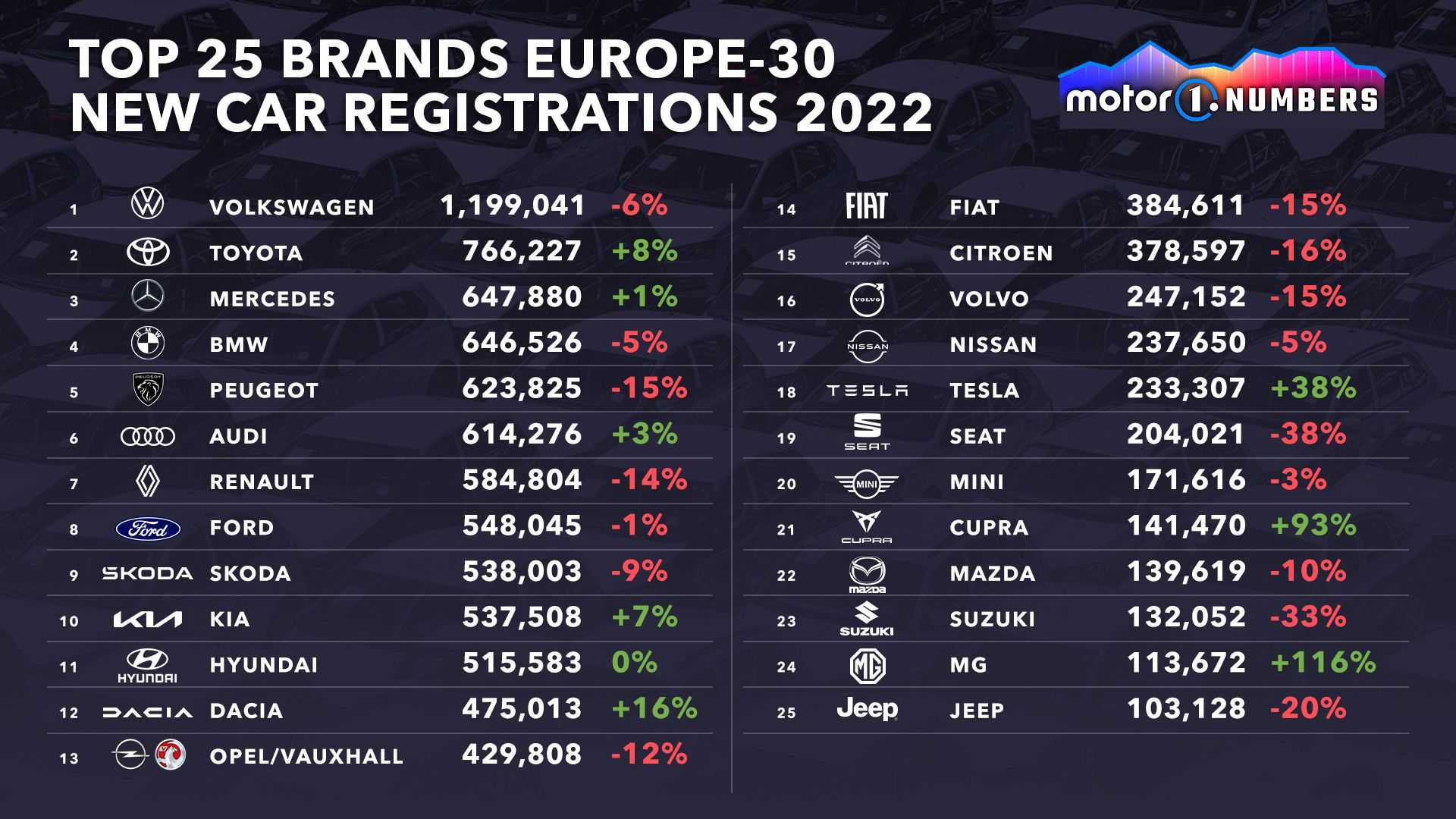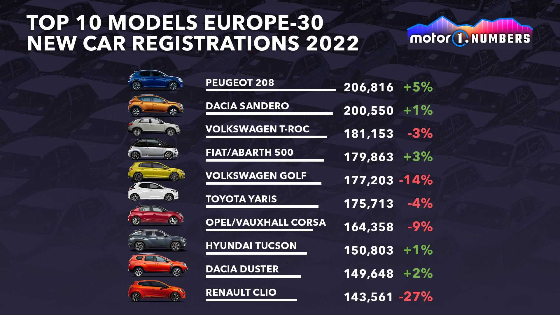 در حالی که بازار خودروهای جدید در اروپا سال خوبی را تجربه نکرد، اما در رتبهبندی کلی مدلهای ۲۰۲۲ سورپرایزهای جالبی به چشم میخورد. براساس اطلاعات منتشرشده توسط JATO، پرفروشترین خودروی جدید در این قاره پژو ۲۰۸ با ۲۰۶،۸۱۶ دستگاه بوده است که حجم فروش آن در مقایسه با سال ۲۰۲۱، رشد 5 درصدی داشته است. در نتیجه پژو برای اولین بار از سال ۲۰۰۷، یعنی زمانی که ۲۰۷ در این رتبه قرار گرفت، جایگاه اول را از آن خود کرد.