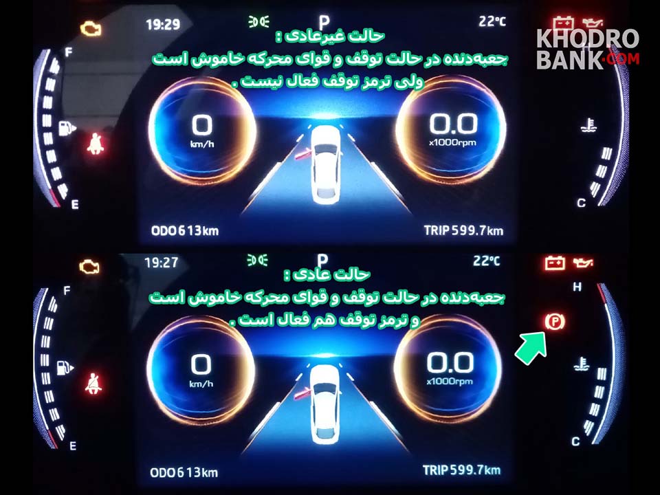 نمایش علامت P باید توجه داشت که در این حالت که ترمز توقف یا همان ترمزدستی غیرفعال است باید برای فراهم ساختن شرایط ایمنی، از طریق قرار دادن مانع در دو سوی چرخها از حرکت ناخواسته خودرو –در حالتی که جعبهدنده در حالت N است- یا وارد شدن فشار به جعبهدنده و درنتیجه خرابی جعبهدنده –در حالتی که جعبهدنده در حالت P است- جلوگیری کرد.