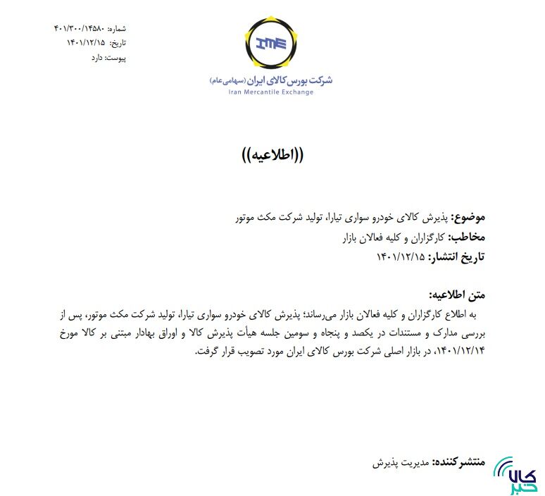 بنا به اعلام سازمان بورس کالا خودرو تیارا محصول مکث موتور به زودی در بورس کالا عرضه خواهد شد. این محصول که پیش از این در چند طرح فروش و به صورت قرعهکشی عرضه شده بود برای اولین بار دربورس کالا پذیرش شده است و به زودی مسخصات دقیق این عرضه اعلام خواهد شد.