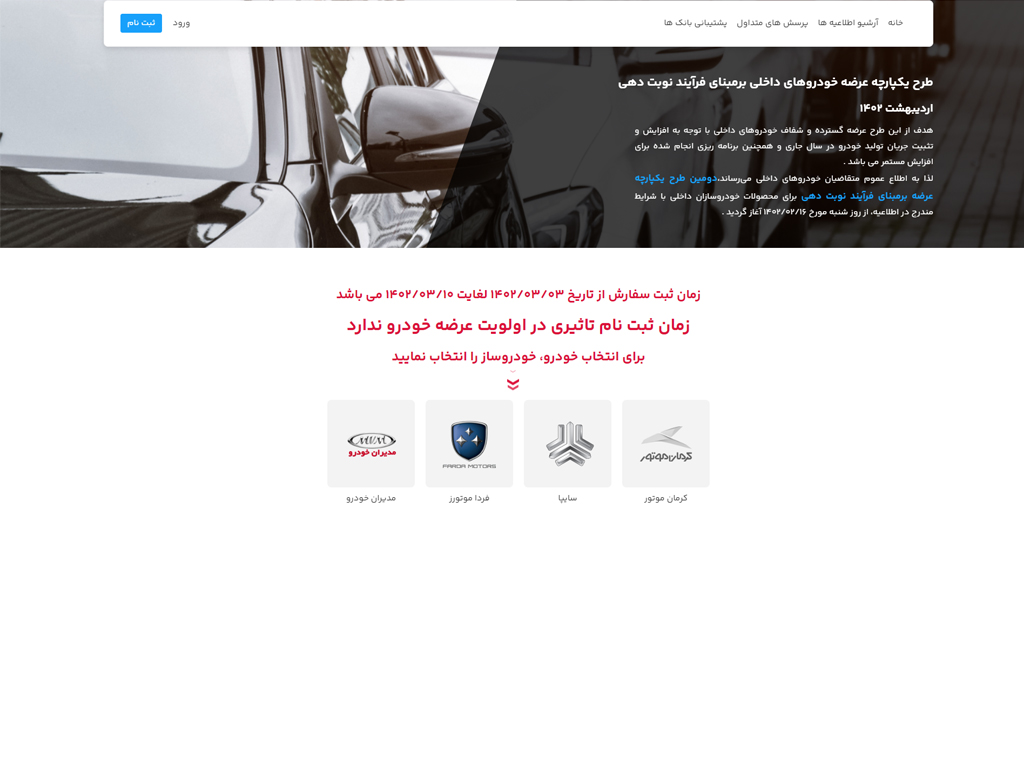 انتخاب خودرو از فردا شروع میشود. مهدی تقدسی، مدیر سامانه یکپارچه تخصیص خودرو، اعلام کرده است که سایت سامانه به آدرس https://esalecar.ir/ از 3 تا 10 خرداد ماه برای ثبت پنج درخواست خرید خودرو فعال خواهد بود.