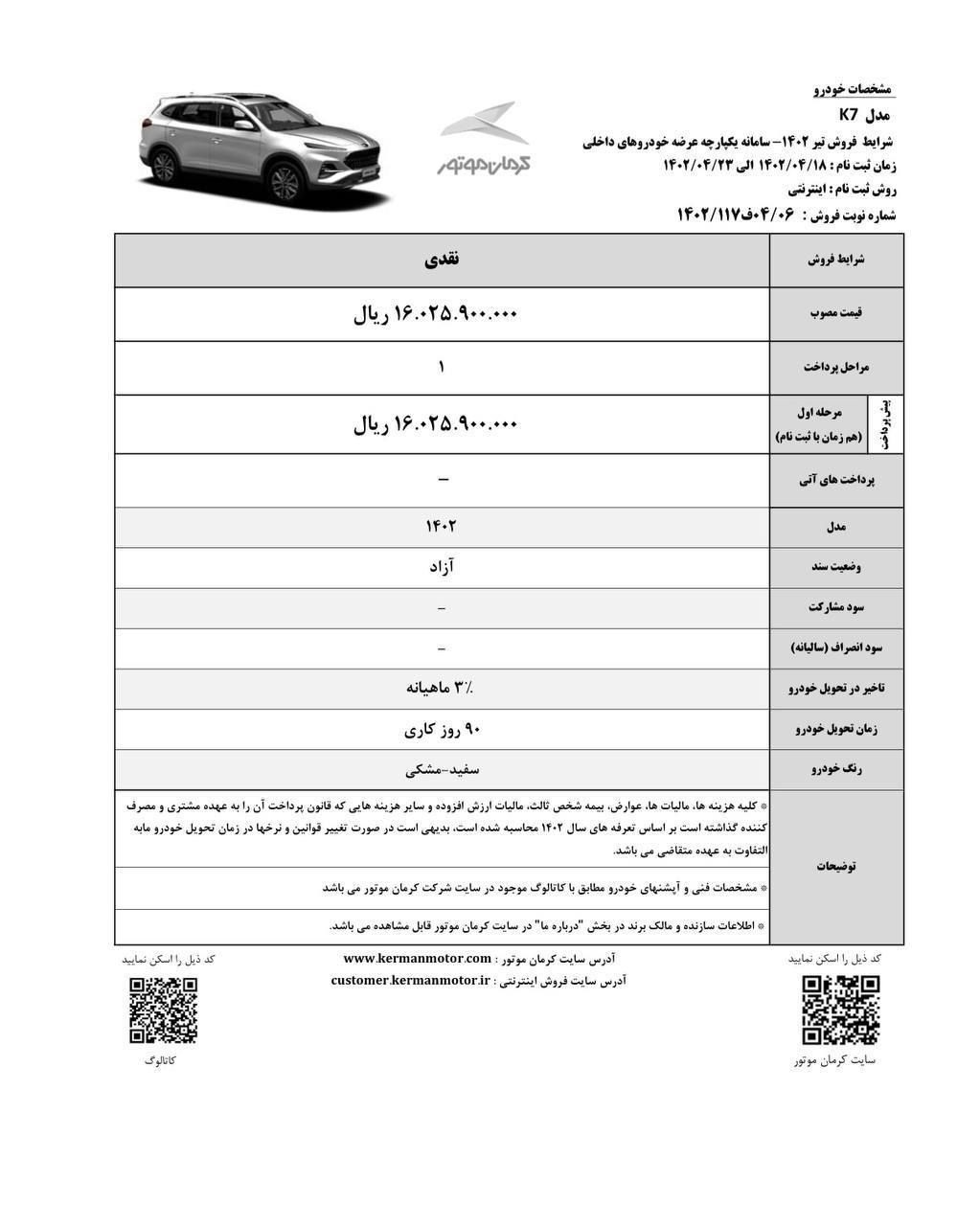 جدول شرایط فروش KMC K7 تیرماه 1402