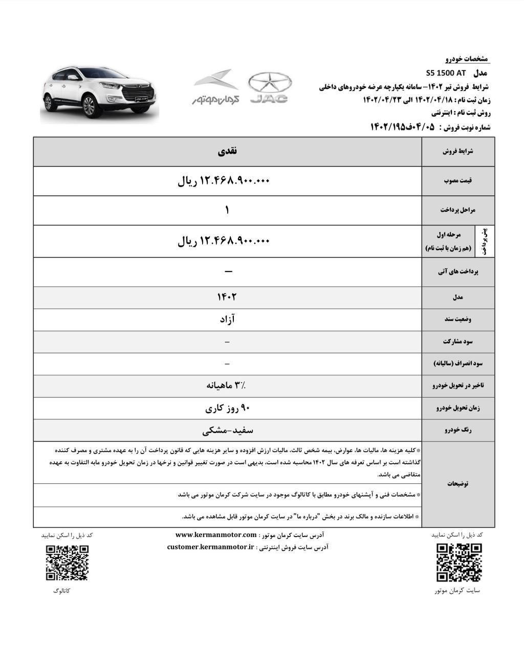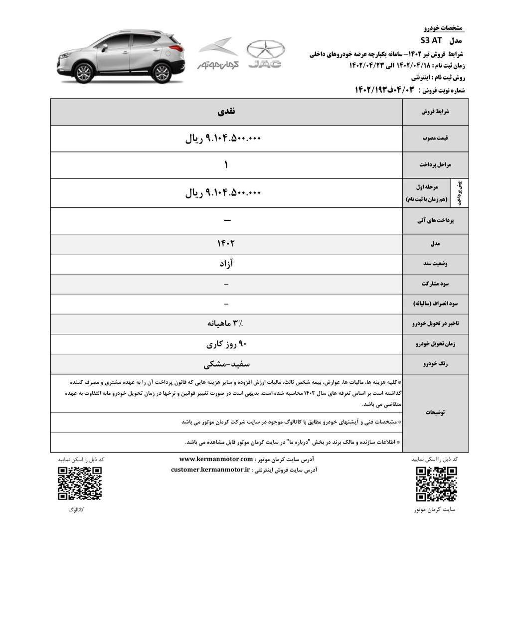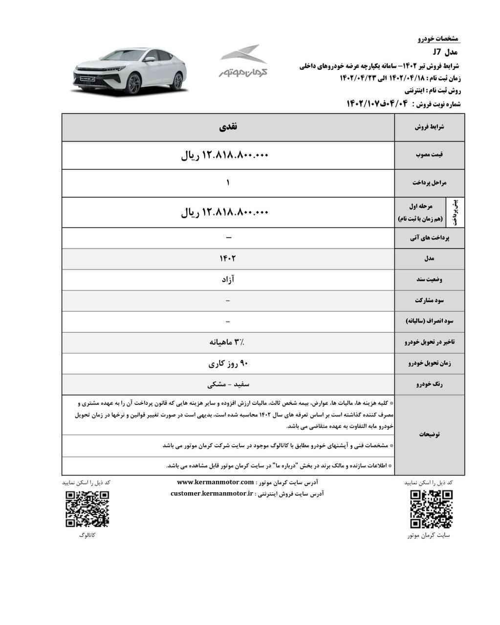 بر اساس اعلام کرمان موتور، شرایط فروش ویژه شرکت کننده گان در سامانه یکپارچه تخصیص خودرو بوده و به صورت اینترنتی از امروز مصادف با 18 تیرماه آغاز و تا 24 تیرماه 1402 ادامه خواهد داشت.