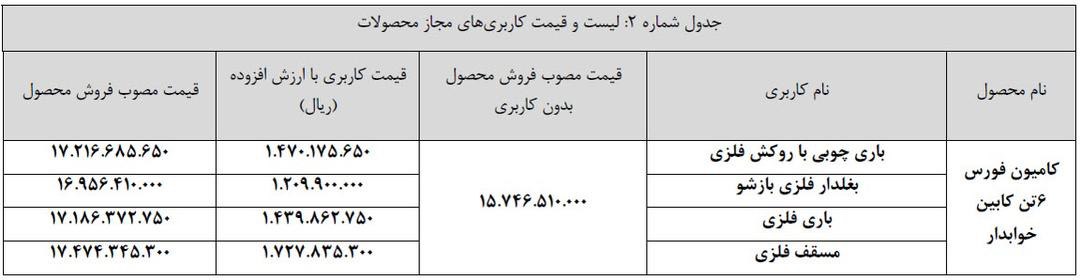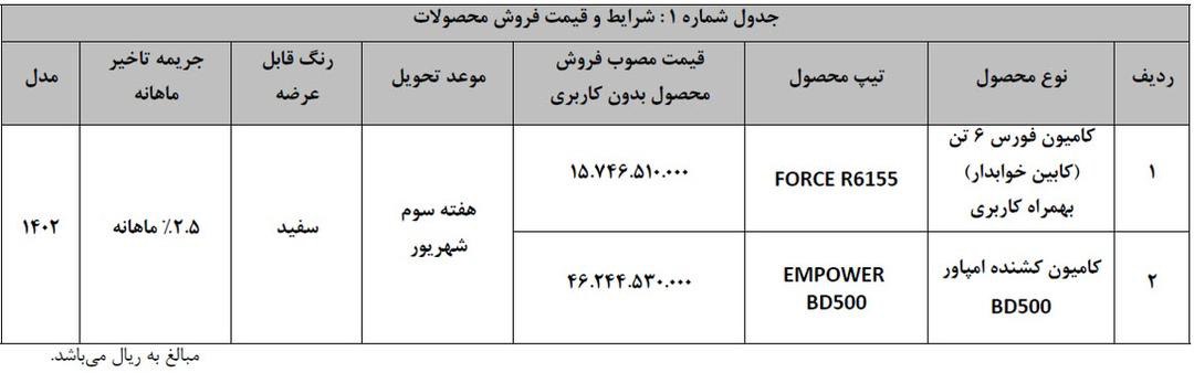 در این بخشنامه ویژه عاملیت‌ها بوده و قیمت فروش فورس 6تن کابین خوابدار حدود یک میلیارد 574 میلیون تومان اعلام شده است که بر حسب انتخاب نوع کاربری هزینه‌ای به این مبلغ اضافه می‌شود. به همین ترتیب کشنده امپاور BD500 حدود 4میلیارد و 624میلیون تومان قیمت گذاری شده است که از طریق همان درگاه قابل خرید است. لازم به ذکر است هزینه کاربری بسته به نوع آن به قیمت فورس 6تن افزوده می‌شود.