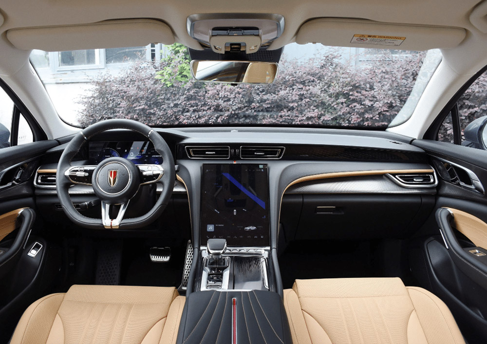 نمای عقب هونگچی H6در داخل کابین، تریم دورنگ بدون تغییر باقی مانده است. نمایشگر اطلاعات سرگرمی ۱۲.۶ اینچی، پنل ۱۲.۳ اینچی LCD پشت فرمان و غربیلک فرمان با دکمههای تخت، بخشهای اصلی داشبورد را تشکیل میدهند. تریمهای مختلف هونگچی H6 از نسخه بهروزشده سیستم شبکه هوشمند Hongqi 3.0 Plus بهره میگیرند که از قابلیتهایی همچون مسیریابی شخصیسازیشده و تشخیص فرمانهای صوتی پشتیبانی میکند. یک پکیج دستیار راننده پیشرفته نیز برای این خودرو عرضه شده است.