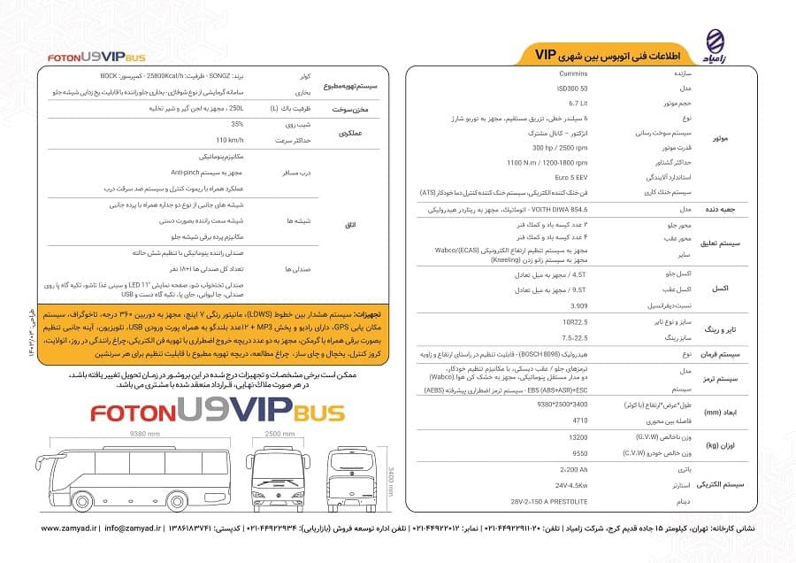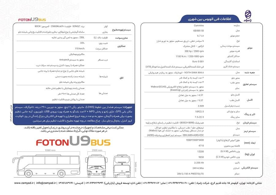 اتوبوس بین شهری فوتون U9 زامیاد، که اخیراً در نمایشگاه خودرو شیراز رونمایی شد، اکنون با انتشار جزئیات کامل مشخصات فنی و امکانات خود، چشم انداز جدیدی را در صنعت حمل و نقل کشور ترسیم می کند.