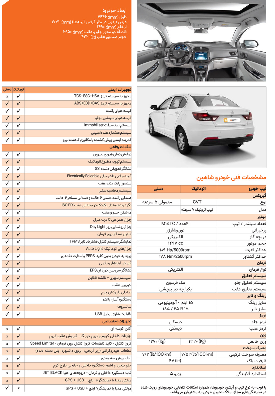 شاهین اتوماتیک CVTاز نظر فنی، شاهین اتوماتیک CVT از همان پیشرانه نسخه دندهای بهره میبرد. این موتور که توسط شرکت مگاموتور ساخته شده، یک نمونه 4 سیلندر 1.5 لیتری توربوشارژ است که با نام M15 توربو شناخته میشود. این پیشرانه قادر به تولید 109 اسب بخار قدرت و 178 نیوتن متر گشتاور است که برای خودرویی در این کلاس، عملکرد مطلوبی محسوب میشود.