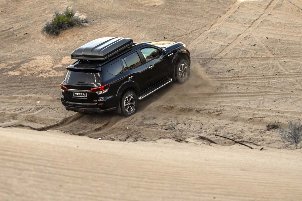 ارتفاع 225 میلیمتری از سطح زمین، همراه با زاویههای ورود 32 درجه و خروج 27 درجه، به نیسان ترا امکان میدهد تا از موانع و ناهمواریهای مسیر به راحتی عبور کند. علاوه بر این، سینی محافظ زیر موتور، از قسمتهای حساس زیرین خودرو در برابر ضربات احتمالی محافظت میکند.