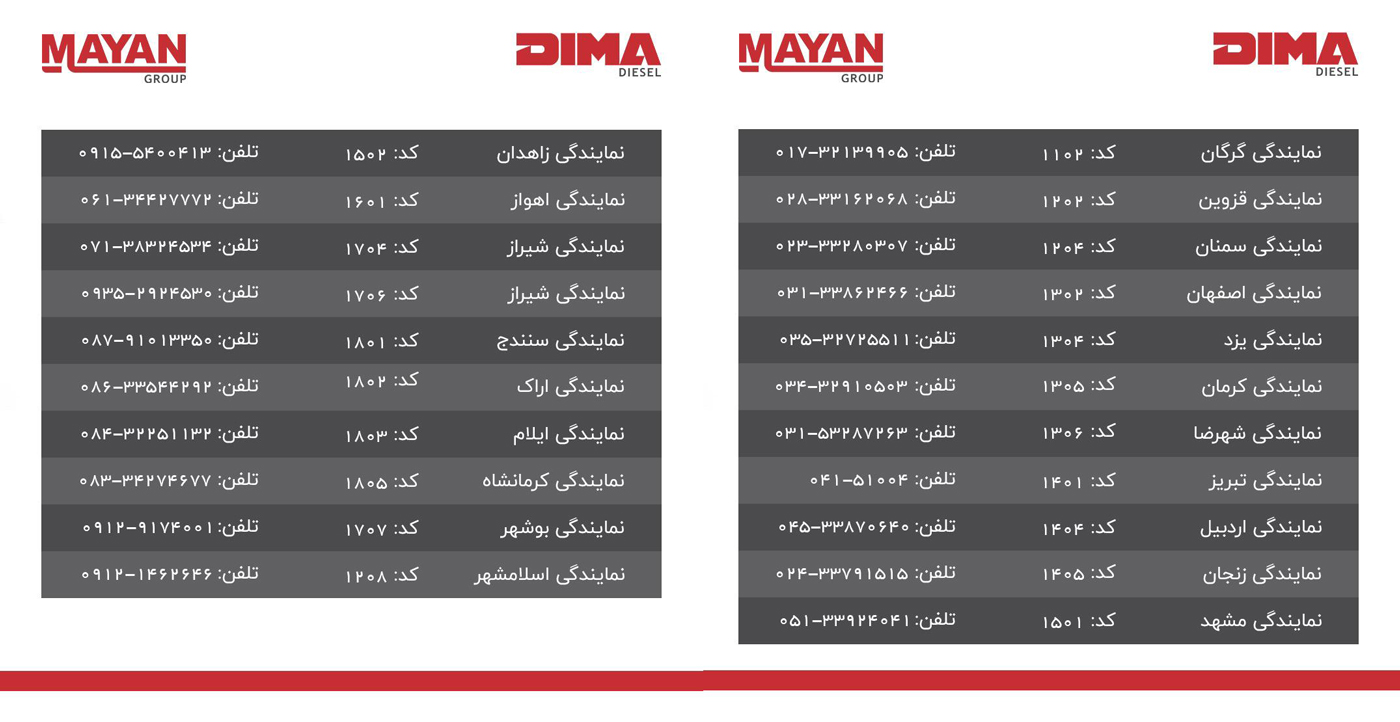در این طرح ویژه، متقاضیان میتوانند با مراجعه به نمایندگیهای مجاز گروه خودروسازی مایان، اقدام به ثبتنام و خرید محصولات دیما دیزل کنند. اطلاعات بیشتر در این خصوص از طریق شمارههای تماس زیر قابل دریافت است: