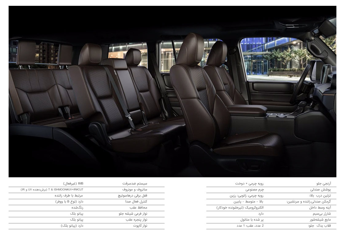 درون کابین، همان منطق طراحی بیرونی ادامه یافته است؛ یعنی ترکیبی از استحکام، کارایی و فناوری مدرن. داشبورد با طراحی افقی و کلیدهای فیزیکی متعدد برای کنترل عملکردهای حیاتی، نشان می‌دهد که تمرکز اصلی بر سهولت استفاده در شرایط مختلف، حتی هنگام رانندگی در مسیرهای ناهموار، بوده است. با این حال، مرکز داشبورد میزبان یک صفحه نمایشگر بزرگ ۱۲.۳ اینچی لمسی برای سیستم سرگرمی و اطلاعات است و صفحه کیلومترشمار نیز کاملاً دیجیتالی و از نوع TFT با همین ابعاد است. استفاده از روکش چرم مصنوعی برای صندلی‌ها و چرم طبیعی برای فرمان و دسته دنده، حس کیفیت را به سرنشینان منتقل می‌کند. این مدل با ظرفیت ۷ سرنشین، دارای سه ردیف صندلی است که ردیف سوم قابلیت جمع شدن دستی را دارد. امکانات رفاهی مدرنی مانند شارژر بی‌سیم، یخچال در کنسول مرکزی، سیستم تهویه خودکار دوگانه و چندین پورت شارژ USB، آسایش سرنشینان را در سفرهای طولانی تضمین می‌کنند.