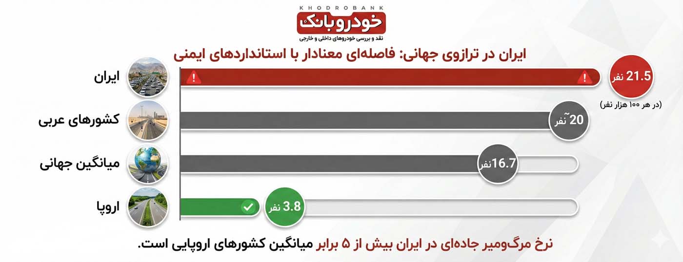 در قاره اروپا، نرخ تلفات جادهای تنها ۳.۸ نفر در هر ۱۰۰ هزار نفر است. این بدان معناست که احتمال مرگ بر اثر تصادف در جادههای ایران بیش از ۵ برابر جادههای اروپاست. حتی در مقایسه با کشورهای منطقه غرب آسیا و شمال آفریقا (با نرخ ۱۹.۲) و کشورهای عربی (با نرخ ۲۰)، وضعیت ایران نامطلوبتر است. تنها مناطقی که آماری نزدیک به ایران دارند، برخی کشورهای آفریقایی و بخشهایی از آمریکای لاتین هستند. این آمار نشان میدهد که کشورهای توسعهیافته با اتخاذ سیاستهای سختگیرانه، بهبود زیرساختها و ارتقای ایمنی خودروها توانستهاند مرگومیر جادهای را به شدت کنترل کنند، مسیری که ایران هنوز در ابتدای آن قرار دارد.