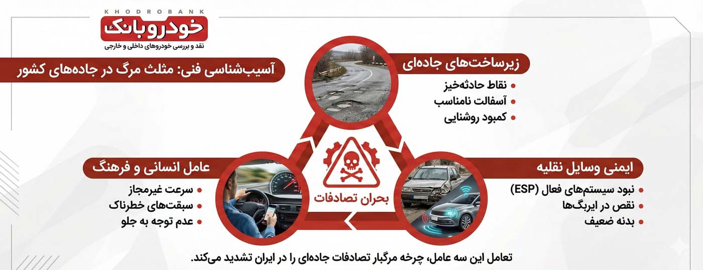 کارشناسان صنعت خودرو و حملونقل، دلایل اصلی بالا بودن نرخ تصادفات در ایران را در سه محور اصلی طبقهبندی میکنند: زیرساختهای جادهای، ایمنی وسایل نقلیه و عامل انسانی. هرچند اغلب انگشت اتهام به سمت "فرهنگ رانندگی" نشانه میرود، اما تحلیلهای دقیقتر نشان میدهد که سهم عوامل فنی و زیرساختی در شدت بخشیدن به حوادث انکارناپذیر است.