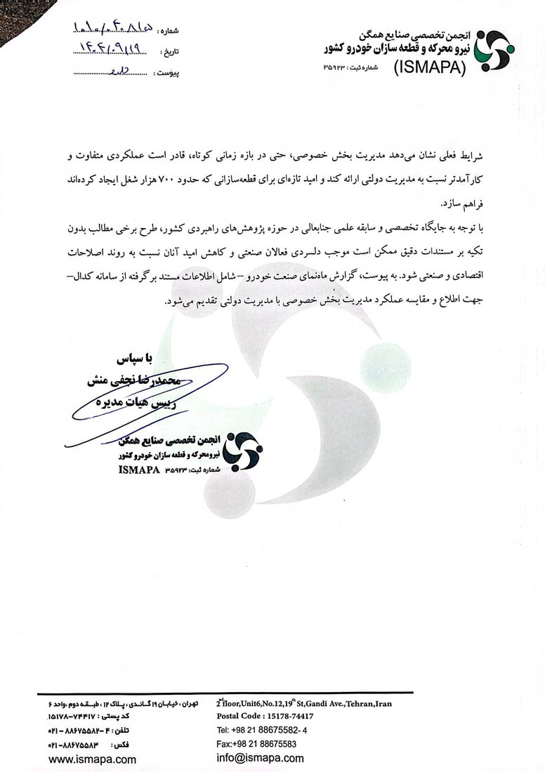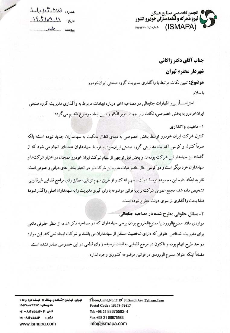 انجمن تخصصی صنایع همگن نیرو محرکه و قطعهسازان خودرو کشور (ISMAPA) در واکنش به اظهارات اخیر علیرضا زاکانی، شهردار تهران، نامهای تفصیلی و افشاگرانه منتشر کرد. این نامه که در تاریخ ۱۹ آذر ۱۴۰۴ تنظیم و ارسال شده است، حاوی پاسخهای حقوقی، فنی و آماری به ابهامات مطرحشده پیرامون نحوه واگذاری مدیریت گروه صنعتی ایرانخودرو به بخش خصوصی است. انجمن در این مکاتبه رسمی، ضمن رد ادعاهای مطرحشده درباره ماهیت واگذاری، با ارائه آمارهای مقایسهای از سامانه «کدال»، عملکرد مدیریت جدید ایرانخودرو را در تقابل با مدیریت دولتی سایپا قرار داده و نسبت به تبعات اظهارات غیرمستند مقامات بر بدنه صنعت هشدار داده است.