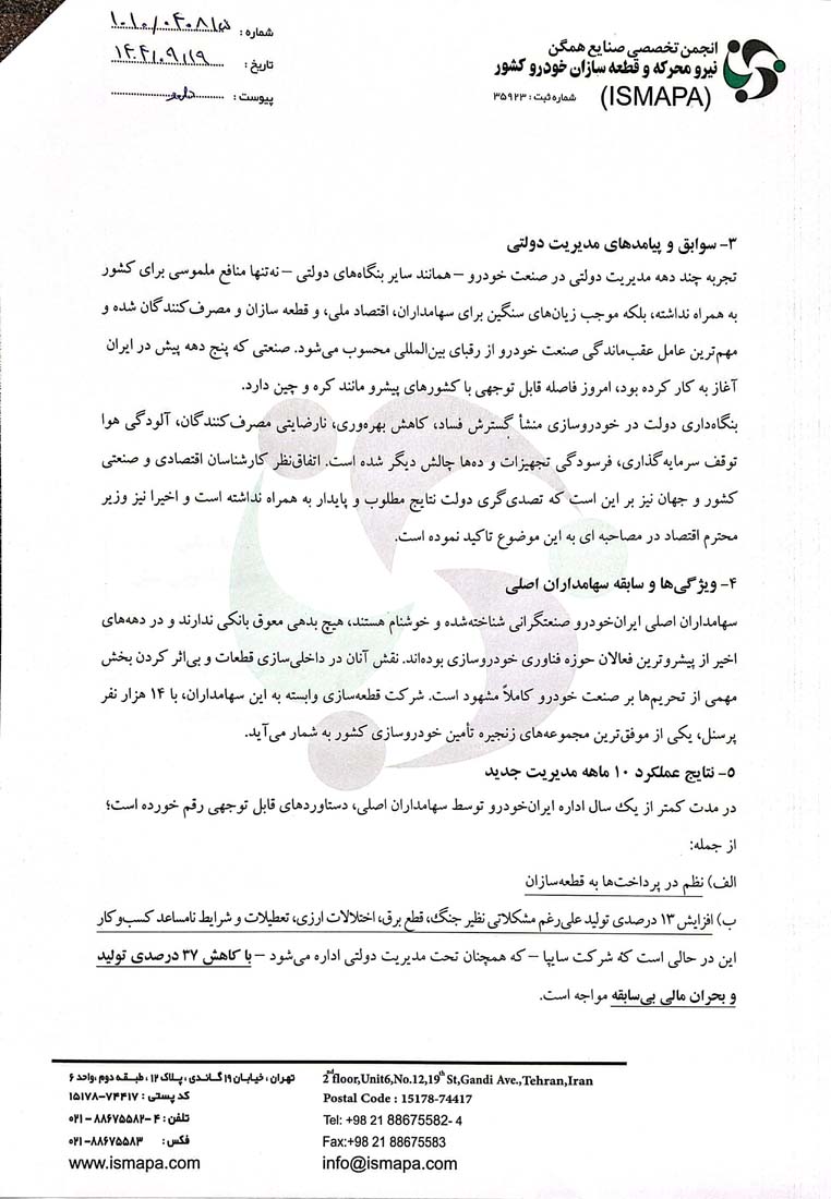 در سوی مقابل، وضعیت گروه خودروسازی سایپا که همچنان تحت سیطره کامل مدیریت دولتی اداره میشود، بحرانی توصیف شده است. آمارهای انجمن نشان میدهد که سایپا در همین بازه زمانی با «کاهش ۳۷ درصدی تولید» مواجه بوده و درگیر یک بحران مالی بیسابقه است. این مقایسه آماری به عنوان سندی بر برتری مدل مدیریت خصوصی بر دولتی به پیوست نامه (تحت عنوان گزارش ماهنمای صنعت خودرو) ارسال شده است تا شهردار تهران و افکار عمومی بتوانند قضاوت دقیقی از تفاوت این دو دیدگاه مدیریتی داشته باشند.