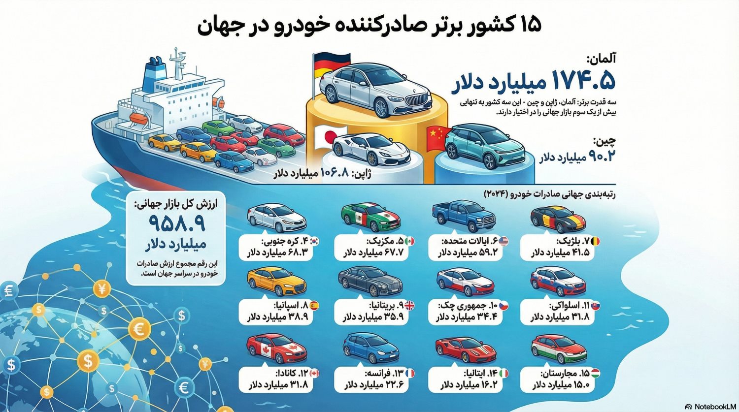 صنعت خودروسازی جهان در سال ۲۰۲۴، فراتر از یک بازار مصرفی، به یکی از حیاتیترین و مهمترین موتورهای تجارت بینالملل تبدیل شده است. در حالی که اقتصاد جهانی با نوسانات متعددی دستوپنج نرم میکند، آمارهای منتشرشده تصویر خیرهکنندهای از این صنعت ارائه میدهند. طبق جدیدترین گزارشها، ارزش کل صادرات خودرو در جهان به رقم نجومی ۹۵۸.۹ میلیارد دلار رسیده است. این عدد بهتنهایی نشان میدهد که خودرو همچنان یکی از استراتژیکترین کالاها در اقتصاد جهانی است و نقش تعیینکنندهای در تراز تجاری کشورهای صنعتی ایفا میکند. بررسی دقیقتر این بازار عظیم و فهرست ۱۵ کشور برتر صادرکننده، حقایق جالبی را درباره توزیع قدرت آشکار میکند. نکته بسیار حائز اهمیت در تحلیل دادههای سال ۲۰۲۴، تمرکز بالای قدرت در دست تعداد محدودی از بازیگران است. آلمان، ژاپن و چین بهتنهایی بیش از یکسوم بازار جهانی صادرات خودرو را در اختیار دارند. این موضوع نشاندهنده انحصار تکنولوژیک و صنعتی در چند قطب اصلی است که عملاً نبض بازار حملونقل جهان را در دست گرفتهاند. در شرایطی که رقابت جهانی در حال تشدید است، کشورهایی که بتوانند سه عامل کلیدی نوآوری، کیفیت و مقیاس تولید را همزمان مدیریت کنند، برندگان اصلی این ماراتن نفسگیر در سالهای آینده خواهند بود. از سوی دیگر، این تمرکز بالا میتواند زنگ خطری برای سایر کشورها باشد، چرا که وابستگی به واردات از این سه قطب، امنیت زنجیره تأمین آنها را تحتالشعاع قرار میدهد.