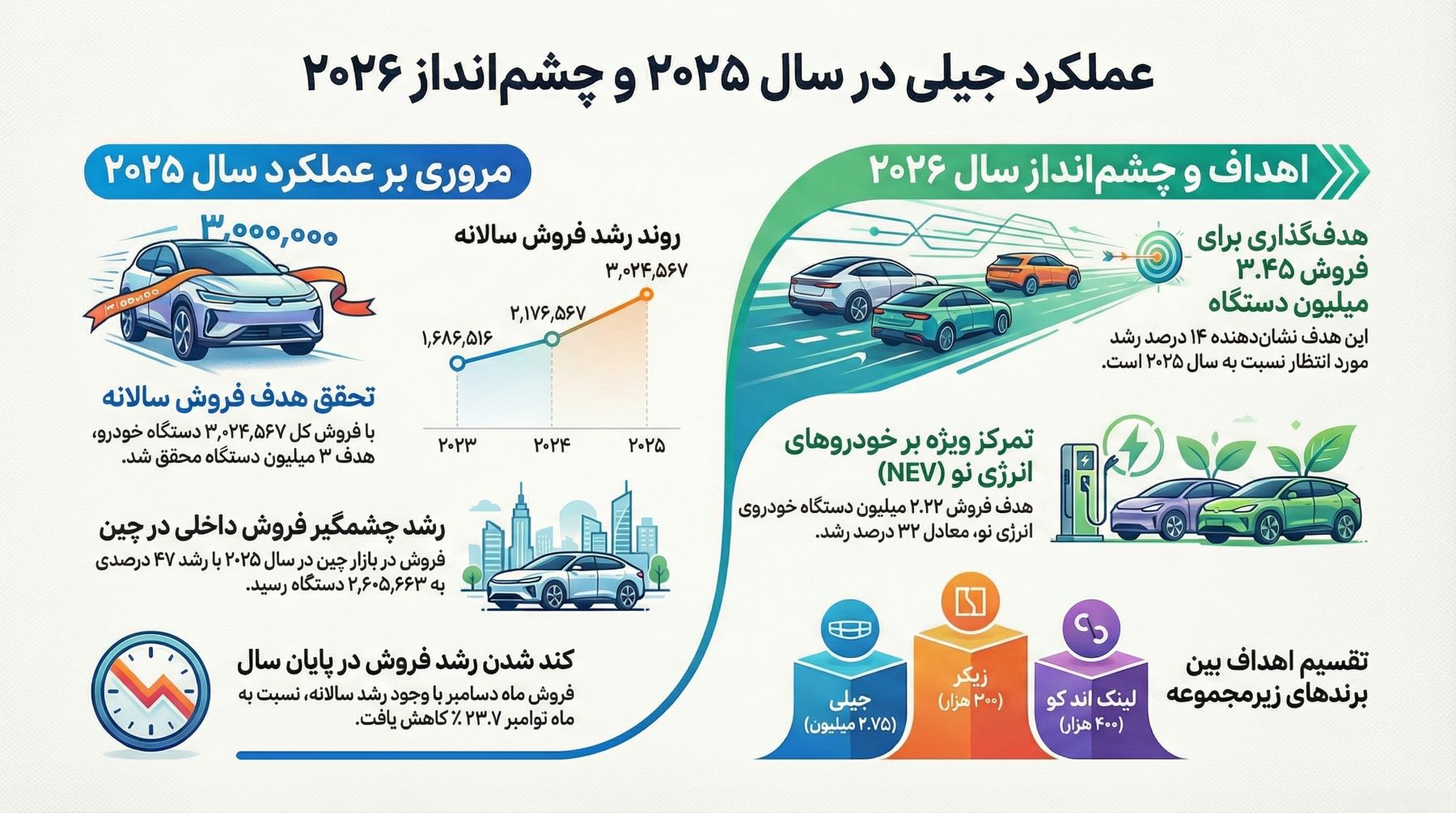 نگاه جیلی به آینده اما بسیار جاهطلبانه است. این شرکت هدف فروش خود برای سال ۲۰۲۶ را روی عدد ۳.۴۵ میلیون دستگاه تنظیم کرده است که به معنای نیاز به رشدی ۱۴ درصدی نسبت به رکورد امسال است. در این نقشهی راه، سهم برند اصلی جیلی ۲.۷۵ میلیون دستگاه، برند زیکر ۳۰۰ هزار دستگاه و برند لینک اند کو ۴۰۰ هزار دستگاه تعیین شده است. دستیابی به هدف ۳۰۰ هزار دستگاهی برای زیکر و ۴۰۰ هزار دستگاهی برای لینک اند کو، نیازمند توسعه مدلهای جدید و نفوذ بیشتر در بازارهای اروپا و خاورمیانه خواهد بود. با توجه به نوسانات پایان سال ۲۰۲۵، تحقق این اهداف در سال ۲۰۲۶ چالشی بزرگ برای تیم مدیریتی و مهندسی جیلی خواهد بود تا تعادل را میان رشد تکنولوژیک و سودآوری اقتصادی برقرار کنند.