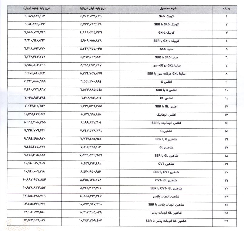 در ادامه، جداول کامل قیمت‌های پایه جدید اعلام شده توسط گروه‌ خودروسازی سایپا و شرکت پارس خودرو که در تاریخ ۲۰ بهمن ۱۴۰۴ در سامانه کدال بارگذاری شده است، ارائه می‌گردد. این جداول شامل تمامی ردیف‌های ذکر شده در نامه‌های رسمی، بدون هیچگونه حذفیات بوده و میزان افزایش ریالی و درصد رشد هر محصول به صورت اختصاصی محاسبه شده است.