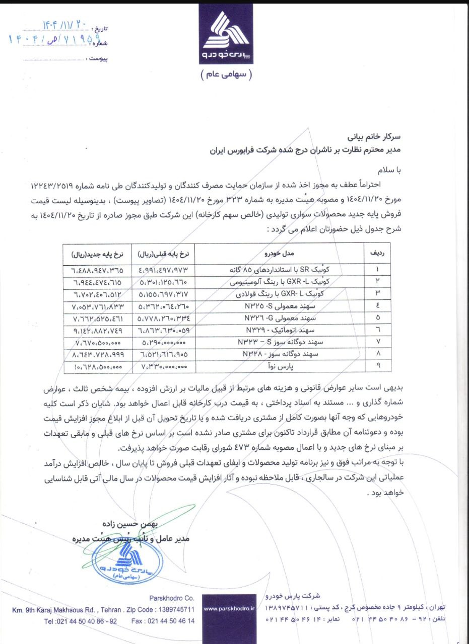 عصر روز دوشنبه، بیستم بهمن‌ماه سال ۱۴۰۴، سامانه کدال شاهد بارگذاری دو نامه بسیار مهم از سوی گروه خودروسازی سایپا و زیرمجموعه آن، پارس خودرو بود. این اطلاعیه‌ها که خطاب به سازمان بورس و اوراق بهادار صادر شده‌اند، مهر تاییدی بر گمانه‌زنی‌های هفته‌های اخیر مبنی بر تغییرات گسترده در نرخ فروش کارخانه‌ای خودروها محسوب می‌شوند. بر اساس اسناد منتشر شده، مجوزهای لازم از سوی مراجع ذی‌صلاح صادر شده و لیست قیمت پایه جدید برای طیف وسیعی از محصولات سواری این دو شرکت اعلام گردیده است. این تغییرات قیمتی که در برخی مدل‌ها با درصدهای قابل‌توجهی همراه بوده، در حالی رخ می‌دهد که بازار خودرو در شرایط انتظار به سر می‌برد و حالا با انتشار این ارقام، داده‌های رسمی جایگزین شایعات شده‌اند. در این گزارش خبری، بدون هیچ‌گونه پیش‌داوری یا تحلیل بازار، صرفاً به بررسی دقیق اعداد و ارقام، محاسبه میزان افزایش ریالی و استخراج درصد رشد قیمت‌ها در هر دو شرکت سایپا و پارس خودرو می‌پردازیم. اسناد نشان می‌دهند که تمامی محصولات، از خانواده کوییک و ساینا گرفته تا خودروهای جدیدتری نظیر اطلس، سهند، شاهین و محصول جدید پارس نُوا (P90)، مشمول این اصلاح قیمت شده‌اند. نکته حائز اهمیت در این گزارش، تفکیک قیمت پایه (خالص سهم کارخانه) از قیمت نهایی مصرف‌کننده است که در ادامه به تشریح کامل آن خواهیم پرداخت.