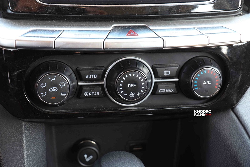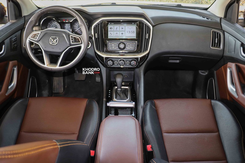 JMC S350نمای داخلی جی ام سی S350 نیز بیننده را به دو دهه پیش میبرد. کابین این خودرو از الگوهای طراحی ساده و کاربردی خودروهای آفرودی استفاده میکند و انبوهی از کنترلرهای فیزیکی را روی داشبورد این خودرو خواهید دید. نمایشگر کوچک سیستم صوتی نیز به صورت فیزیکی کنترل میشود. طراحی اهرم ترمز دستی نیز در این خودرو جلب توجه میکند، چرا که ظاهر آن شبیه به اهرمهای کنترلی کابین هواپیما است. وجود نشانگرهای آنالوگ و کنترلرهای فیزیکی نیز به راننده کمک میکند تا طی زمانی کوتاه با کابین JMC S350 هماهنگ شوند. در نسخهای که ما برای تست در اختیار داشتیم، تریم داخلی خودرو از رنگهای مشکی و قهوهای تشکیل شده بود که هماهنگی قابل قبولی را در کنار یکدیگر تشکیل داده بودند.