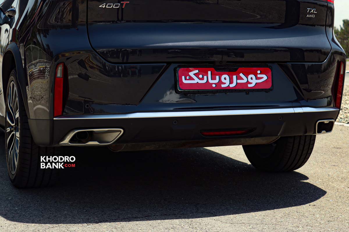نمای عقب اکستریم TXLدر نمای عقب، چراغهای LED با طراحی خاص و نوار کرومی که آنها را به هم متصل میکند، ظاهری مدرن و یکپارچه به TXL بخشیده است. سپر عقب با دیفیوزر و خروجیهای اگزوز دوگانه، بر جنبه اسپرت خودرو تأکید میکند. درب صندوق عقب بزرگ، علاوه بر زیبایی، دسترسی آسان به فضای بار را فراهم میکند.