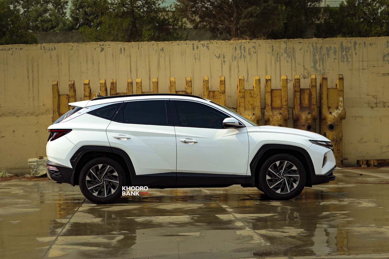 طراحی کنارههای بدنه با خطوط تیز و برجستهای که از کاپوت تا چراغهای عقب امتداد دارند، نمایانگر حرکت و پویایی خودرو است. این خطوط که با دقت بر روی بدنه خودرو قرار گرفتهاند، حس عضلانی بودن توسان را تقویت کرده و به آن شخصیتی اسپرت و مدرن میبخشند. گلگیرهای عقب و جلو با طراحی برجسته و فرمهای تیز، در کنار رینگهای اسپرت که بهطور خاص برای این مدل طراحی شدهاند، جذابیت بیشتری به نمای کناری خودرو میدهند.
