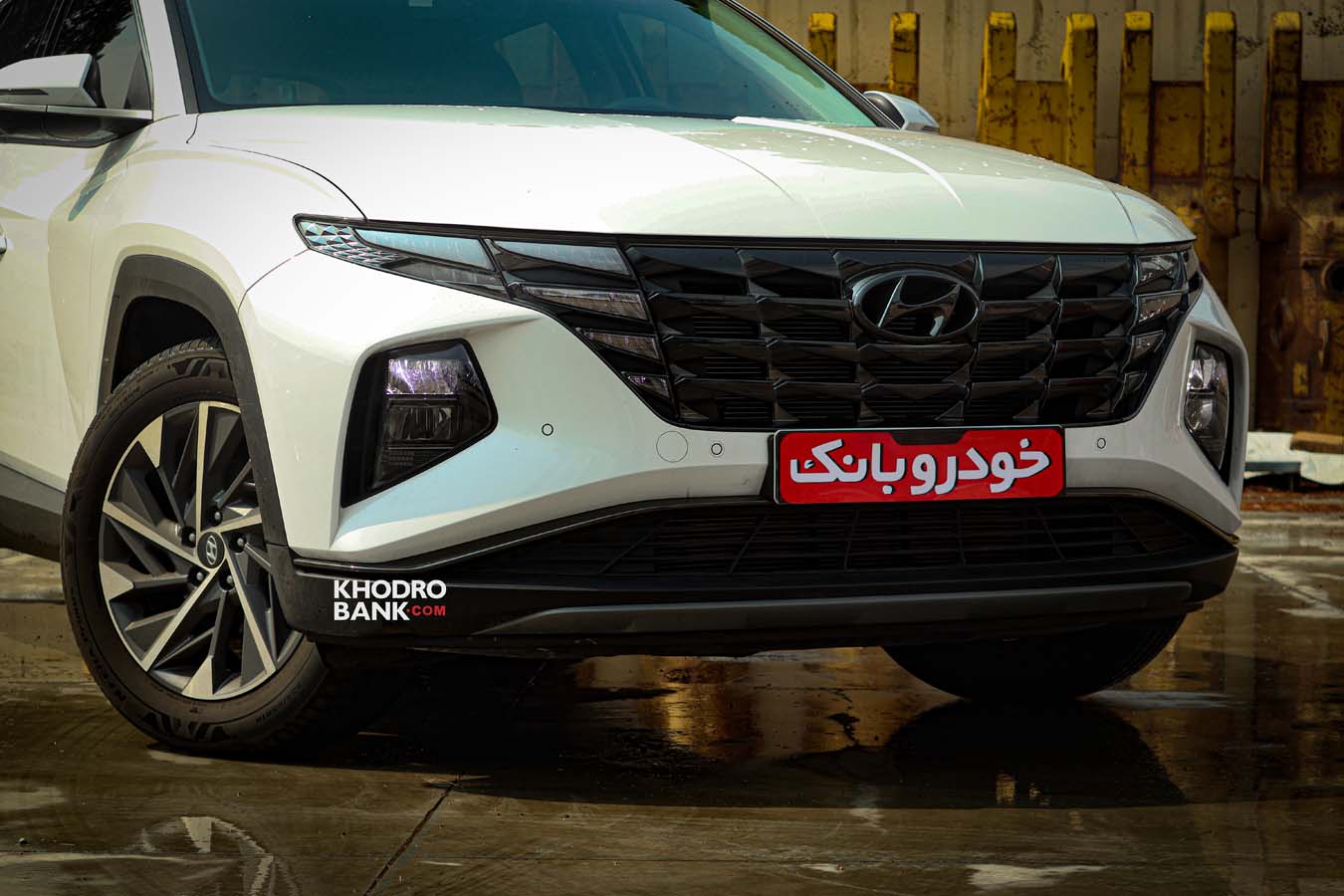 از نمای جلویی، اولین عنصری که توجه شما را جلب میکند، جلوپنجره بزرگ و چند ضلعی "Parametric Jewel Grille" است که بهشکل شبکهای از الماسهای هندسی طراحی شده است. این جلوپنجره با ترکیب چراغهای باریک و کشیده LED که در طرفین آن قرار گرفتهاند، به خودروی توسان 2023 ظاهری جسورانه و تهاجمی بخشیده است. چراغهای روز روشن (DRL) که بهطور ماهرانهای در جلوپنجره ادغام شدهاند، به طراحی نمای جلویی شکوه و تمایزی خاص میبخشند.